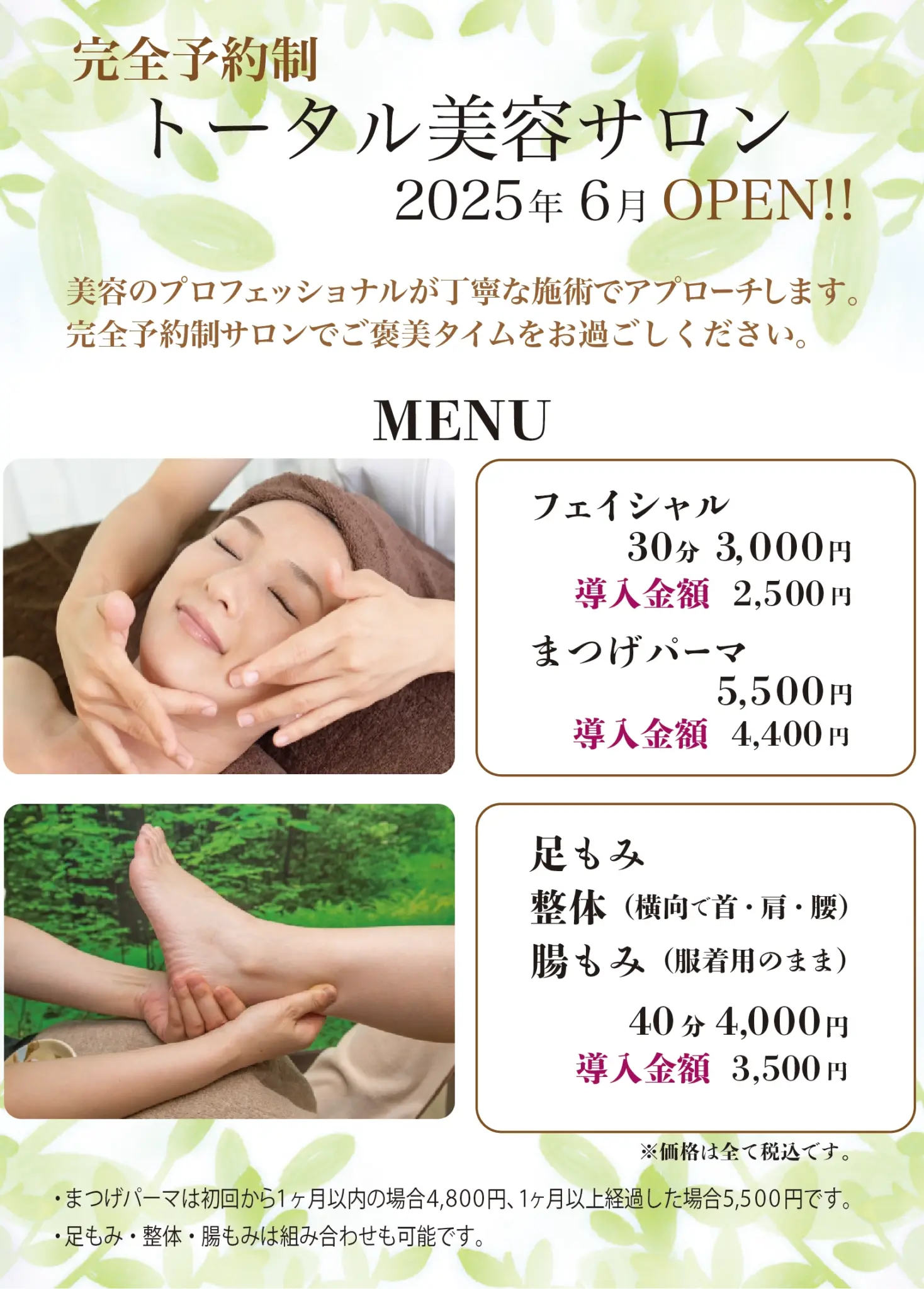 【概要】 行きつけのマッサージ店様よりご依頼 【使用ツール】Illustrator 【制作期間】 1日間 【制作内容】 ターゲット:20〜40代イメージ:癒し その他マッサージ店のオーナーが美容サロンへ出張オープンするにあたりメニュー作成しました。